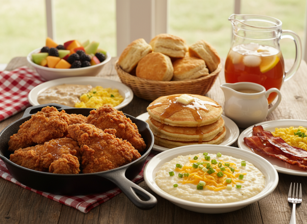 Steak & eggs  •  Chicken & waffles  •  Shrimp & grits  •  Farm-style scrambled eggs  •  Breakfast casserole  •  Belgian waffles or pancakes