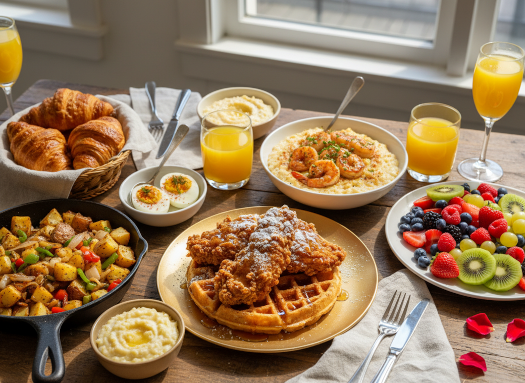 Chicken & waffles  •  Shrimp & grits  •  Steak & eggs  •  Brunch sliders  •  Breakfast tacos  •  Lobster mac & cheese (upgrade)