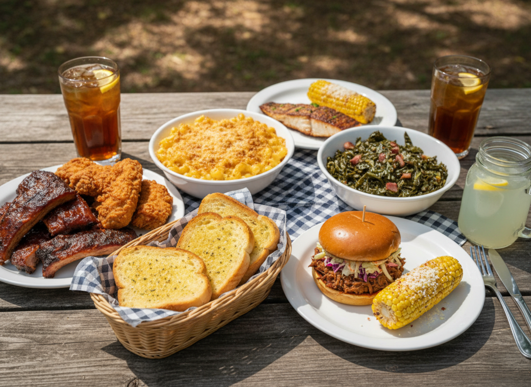 Southern meats under string lights — steak, 5-cheese mac, collard greens, cornbread, warm glow. Slow-smoked. Butter-seared. Freshly plated.